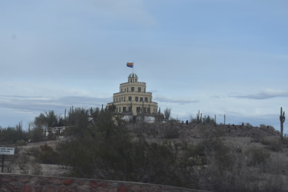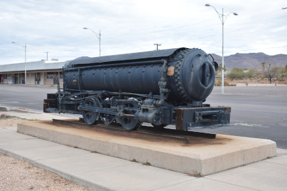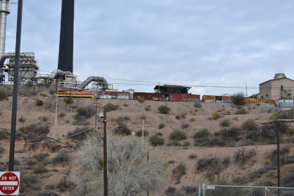Elizabeth and I got up at 6:45 AM, dressed and went to Denny's for breakfast down the hill from our hotel. We checked out, drove to Miami and checked for Arizona Eastern motive power at their yard. We looked up at the hill across and saw a train up on the high line.
