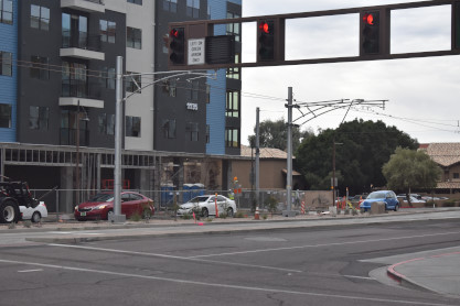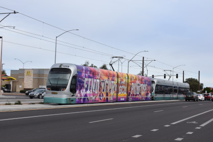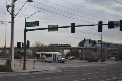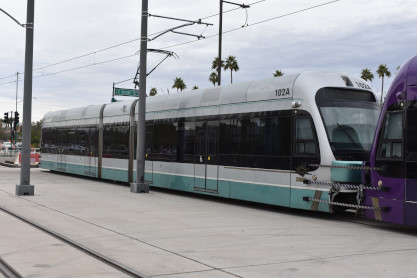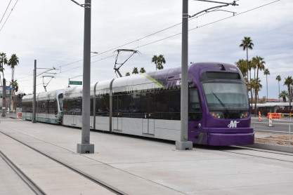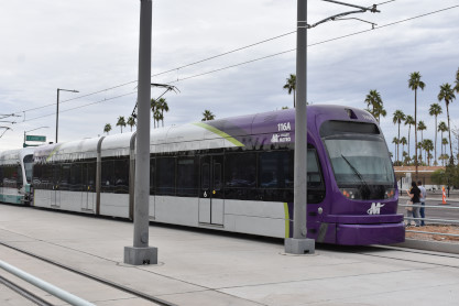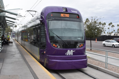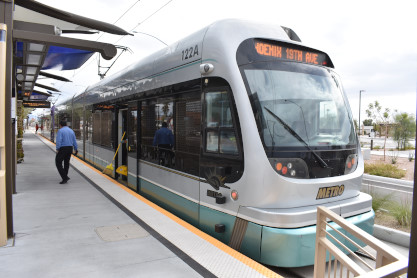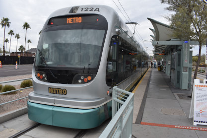 Valley Metro Rail InformationValley Metro Rail (styled corporately as METRO) is a 28.2-mile light rail line serving the cities of Phoenix, Tempe, and Mesa in Arizona. The network, which is part of the Valley Metro public transit system, began operations on December 27, 2008. The line carried 49,416 passengers per day in 2016, making it the 14th busiest light rail system in the country. In the years since it opened in 2008, the system has undergone two expansions, with at least five more scheduled, including the Tempe Streetcar. Furthermore, extensions are planned into West Phoenix and South Phoenix to Baseline Road, all of which were expanded as a direct result of obtaining funding under the Proposition 104 sales tax increase. As of 2019, the Valley Metro Rail system consists of one single line serving all 38 stations total, and denoted with a gold-yellow color on Valley Metro publications. The line starts in Phoenix at the 19th Avenue/Dunlap station on its own right-of-way south of Dunlap Avenue, before turning south on 19th Avenue for 4 miles. It then turns eastward on Camelback Road for 2.5 miles, then turns south onto Central Avenue where it continues all the way into Downtown Phoenix. At Roosevelt, the line splits into one-way segments: Mesa-bound service runs on First Avenue south before turning east on Jefferson Street; likewise, Dunlap-bound one-way service starts at 26th Street on Washington Street before turning north on Central Avenue. After both tracks rejoin east of 24th Street on Washington Street, it continues past Sky Harbor Airport – which is connected by the PHX Sky Train at 44th Street/ Washington – then turns southeast toward Tempe. The line leaves Washington Street and crosses Tempe Town Lake on its own bridge parallel to the Union Pacific Railroad before turning east along Mill Avenue and then proceeding via its own right-of-way near Arizona State University. Going southward, it joins Apache Boulevard headed eastward, which becomes Main Street in the city of Mesa, where the light rail line ends at an intersection with Gilbert Road.