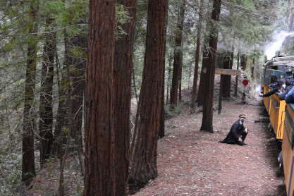 Roaring Camp and Big Trees Heisler 2 "Tuolumne" pulling the train forward.