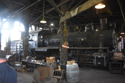Sierra Railroad 2-8-4 34, ex. Fred Kepner, exx. Reed Hatch 1962, exx. Sierra Railroad Company 34, nee Sierra Railway Company 34, built by Baldwin in 1925. It worked on the Melones Dam on the Stanislaus River and then in 1935, on the Hetch Hetchy Railroad. The Hetch Hetchy project in the Sierra Nevada Mountains of Yosemite Park was huge. Intended to meet the water needs of San Francisco, as well as dams, it involved conduits, powerhouses and a one hundred and fifty mile aqueduct. Machinery, equipment and thousands of workers had to be transported to remote sites, and the Hetch Hetchy Railroad, a sixty-eight mile line was built from the edge of the Hetch Hetchy Valley and the O'Shaughnessy dam site to the Sierra Railway at Hetch Hetchy Junction. After completion of the project, 34 returned to hauling freight. It was retired in 1955 and spent much of its time in storage at Jamestown. It was sold to Reed Hatch in 1965 for $1,500, but stayed at Jamestown and was leased back to Railtown to run excursions until 1980.