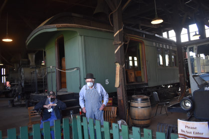 Sierra Railway caboose 7 originally Elgin, Joliet and Eastern built by the railway in 1923. I found Elizabeth standing in line but realized I had forgotten my business cards so returned to the car then re-joined Elizabeth who was ready to board. They kept us socially distanced and everyone had to use hand sanitizer before boarding. We had chosen car 599, formely Canadian Pacific coach 1424 built in 1912 then it became mountain observation car 599, when buying the tickets and climbed aboard.