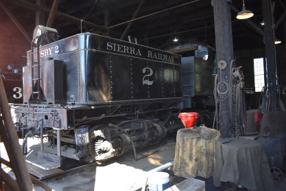 Sierra Railroad 3 truck shay 2, ex. donation to State of California, exx. Feather River Railway Company 2 1939, exxx. Feather River Pine Mills Incorporated 2 1927, nee Hutchinson Lumber 2 built by 1912. It was used to haul log trains for the lumber company's Feather River Railway from 1922 until 1966. The railroad was abandoned in 1967, after flooding of a portion of its line by Oroville Dam, thereafter Shay 2 was donated to the State of California. In 1975, Shay No. 2 was leased to the Sierra Railroad and moved to Jamestown where it was rebuilt for tourist excursion service. Today, the locomotive remains at Railtown 1897, however the locomotive is out of service awaiting restoration.