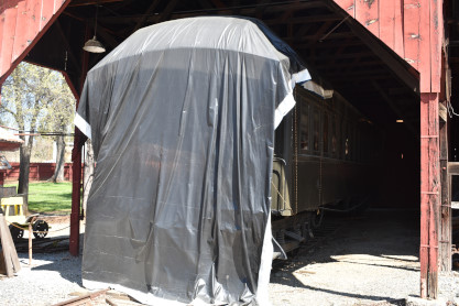 Central Pacific wood open-platform coach 2, ex Hetch Hetchy, exx Ocean Shore Railroad, exx Southern Pacific 1133, nee Central Pacific 43 built by Wason Manufacturing in 1869 undergoing restoration. This car was present at the driving of the Golden Spike ceremony at Promontory Summit.