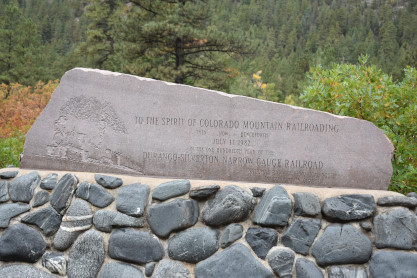 "To The Spirit of Colorado Mountain Railroading Then-Now-Henceforth in the 100th Year of the Durango-Silverton Narrow Gauge Railroad" plaque installed by the Intermountain Chapter of the National Railway Historical Society.