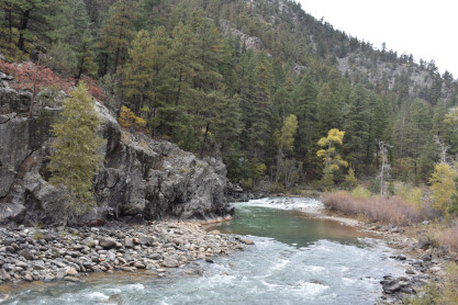 Southern Pacific 18 ran by us on the way to pick up the train. We waited for it to come back to the station then all boarded coach 323 Animas River. The train consisted of Southern Pacific 18, Durango and Silverton covered open air car, coach 323 "Animas River", 632 "Red Mountain" and covered open air car 314. Once everyone was onboard, we departed Durango a few minutes late, but we were off. We left the city scenes and entered a more rural countryside and made our way to Hermosa to water the steam engine.