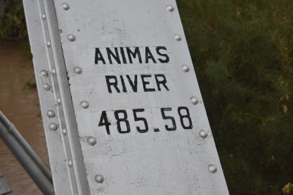 The location on the Animas River where the bridge once was in Cedar Hill. We thanked Keva for an excellent tour and we returned to our room at the Quality Inn. After checking e-mail, I converted and labelled the pictures before starting the story. Elizabeth and I went across the road in the rain to the Village Inn for dinner then came back to the hotel where I finished the story and Elizabeth did her things on the Internet.