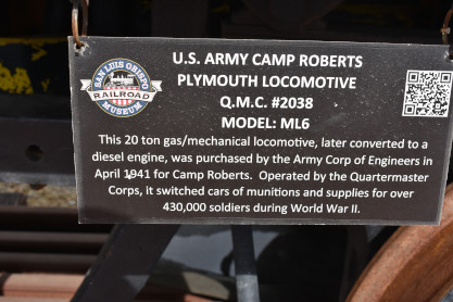 United States Army ML-6 2038. This Plymouth 20 ton switcher was purchased by the Army Corps of Engineers and delivered to the camp in April 1941 to develop and supply Camp Roberts, near San Miguel. Operated by the Quarter Master Corps as Q.M.C. 2038, the locomotive switched railroad cars of munitions and supplies for over 430,000 soldiers who were trained at the camp during World War II. It was the only locomotive ever operated at Camp Roberts in San Luis Obispo County.