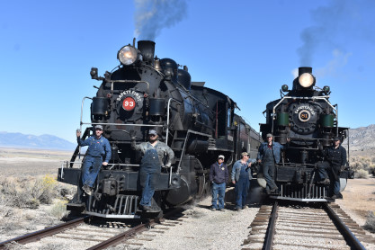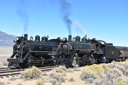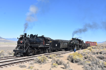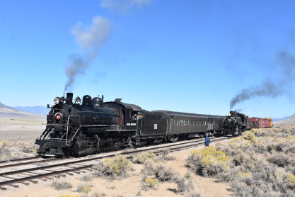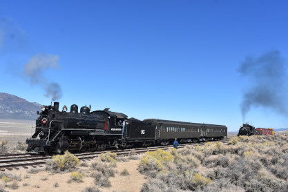 Photo runby ten with Nevada Northern 93 at the Big Cut. We reboarded the pasenger train and we went to Lavon siding for some side-by-side action plus more. Once there, our passenger train unloaded in the siding before it reversed down the siding.