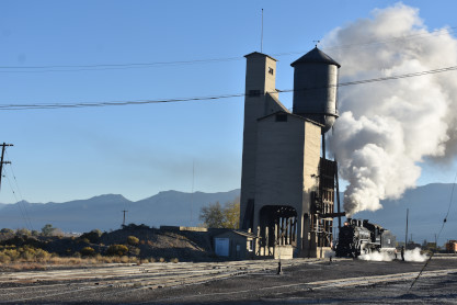 Nevada Northern 93 takes on water prior to coupling up to our train. We left Ely and we went to Moser Cut to do photo runbys.