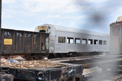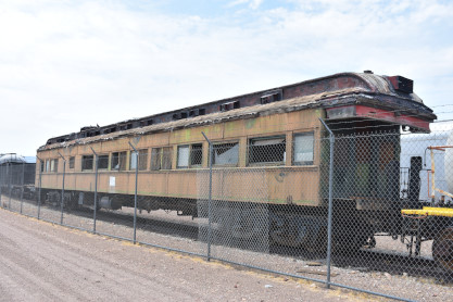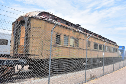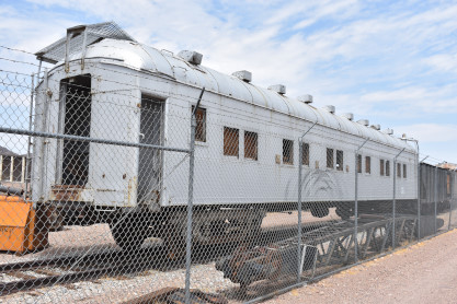 Union Pacific dorm-lounge 6100 built by American Car and Foundry in 1949, photographed through the fence.