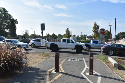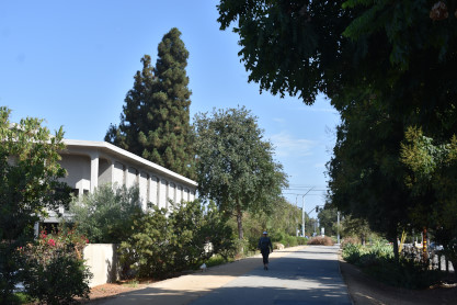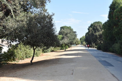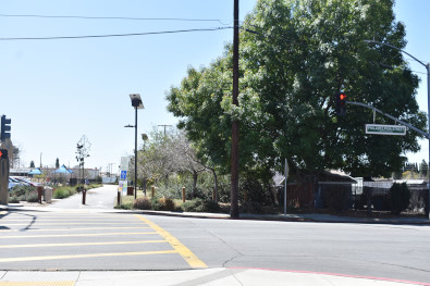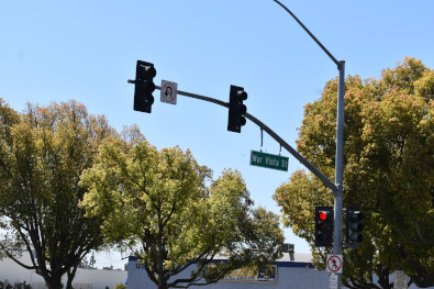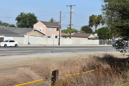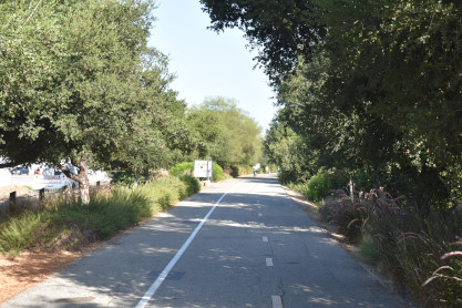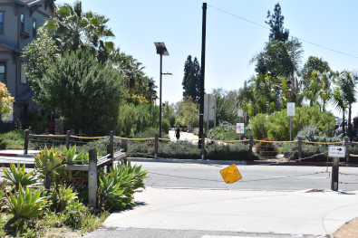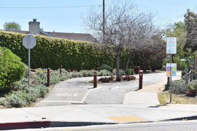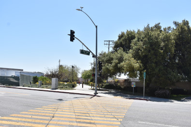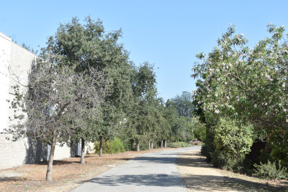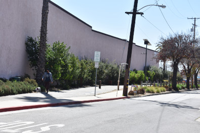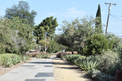We crossed Gregory Avenue and are walking beside Whittier High School.
