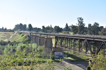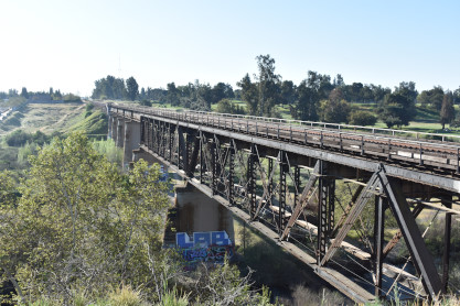 We got up and checked out and after filling the car with petrol, we drove to the Train Depot Restaurant where I had French Toast and crispy bacon while my loving wife Elizabeth had egg, sausage, hash browns and toast. This place is full of railroad pictures, model trains, a train that runs around the ceiling and a ticket window that the cashier uses. We then drove to the north side of the former Santa Fe Railroad bridge across the San Joaquin River but had an westbound train pass us just as we arrived and parked.