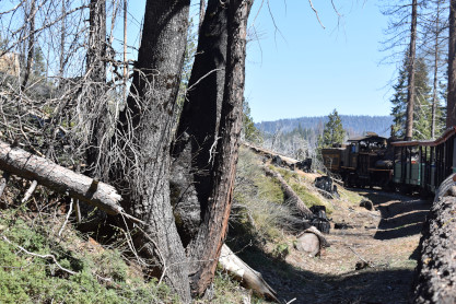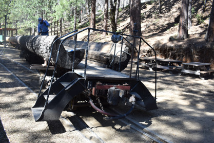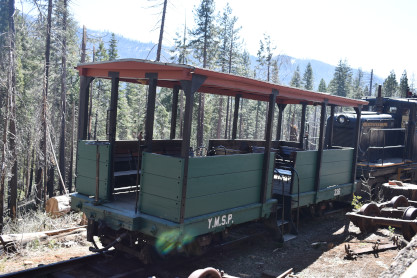 The current railroad follows a portion of grade originally carved into the mountain by the Madera Sugar Pine Lumber Company in the early 20th century. The company originated in 1874, when it was organized as the California Lumber Company to log the area surrounding Oakhurst, California. The Madera Sugar Pine Lumber Company once had a large sawmill at Sugar Pine, California, just south of the current YMSPRR. The railroad had seven locomotives, over 100 log cars, and 140 miles of track in the surrounding mountains. In addition to the railroad, the Company also transported lumber in a flume that stretched 54 miles from Sugar Pine to Madera, California. This was the most efficient way to transport rough cut lumber out of the mountains for finishing and transport at the bottom of the mountain. The Madera Sugar Pine Lumber Company practiced clearcutting, which removed almost every single tree within the stands of timber surrounding the YMSPRR track. The thick forest surrounding YMSPRR today belies this history, although large stumps from the original old growth timber dot the forest floor lining the tracks. Due to the onset of the Great Depression and a lack of trees, the operation closed in 1931. But the graded right-of-way through the forest remained, enabling the Stauffer family to reconstruct a portion of the line in 1961. The current railroad utilizes locomotives, converted log disconnect cars, and other railroad equipment purchased from the West Side Lumber Company after it ceased railroad operations in 1961. Max Stauffer died on March 10, 2017. In late August 2017, the Railroad Fire, which started near the railroad, destroyed West Side Lumber Company equipment stored on a side track.