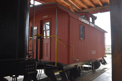 I looked out of the window at this point and saw Wheeling and Lake Erie caboose 0222 built by the railroad in 1948. After serving the W&LE and its corporate successors, the Nickel Plate Road and Norfolk and Western, this caboose became the property of a tourist train operator in Minerva, Ohio. After that organization went out of business, Age of Steam acquired the car. After a multiple-year wait, 0222 finally moved by train to the Roundhouse in 2015. Age of Steam crew members carefully sanded and repainted the caboose following the original paint blueprints. While numerous former W&LE steel cabooses still exist, 0222 is among very few restored to as-built condition and paint.