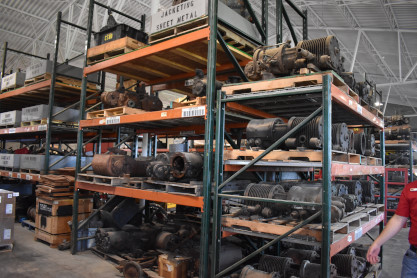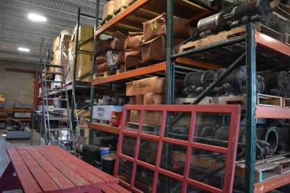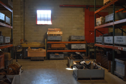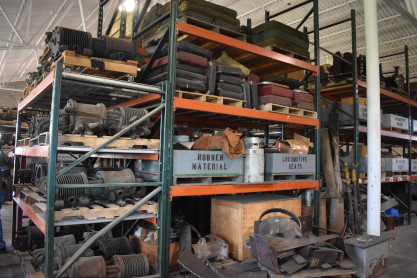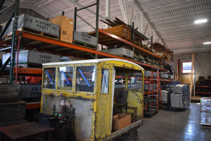 A Montour Railroad speeder and neatly organized shelving of parts.