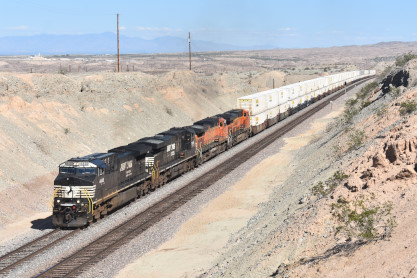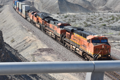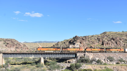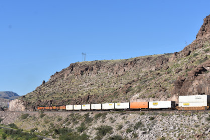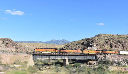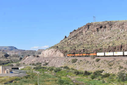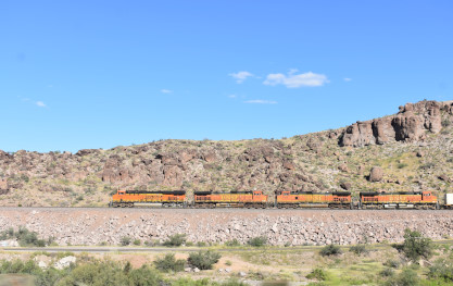 I crossed the road and just managed to get BNSF 5856 East with the guard rail, as this train silently snuck up on us. After that we crossed the Colorado River into Arizona and drove most of the way to Kingman, where we took the road through Kingman Canyon and had another train.