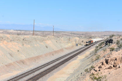 9/15/2022 After waking up and having a good breakfast, Elizabeth and I finished packing, checked the Internet and I watched "Perry Mason". At 10:00 AM we loaded the car and Elizabeth drove us north on CA Highway 55 then east on CA Highway 91 to Interstate 215, to Tnterstate 15 and Barstow. We visited the outdoors of the railroad museum but did not take photographs as we had been there in July 2020, then went inside the station/Harvey House to look around as we had not been inside before. They had a sizeable solar system/space exploration exhibition. Elizabeth then drove us to Interstate 40, where east of Daggett we switched drivers and I drove us east to Goffs Road where we stopped for the first train of the trip.