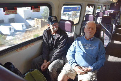 On the left is Robin Bowers, who boarded in Santa Ana, and on the right is David Aten, who boarded in Orange. Just after leaving Santa Ana the train stopped at CP Lincoln and a BNSF auto rack train went by us on track two. We crossed over pass dead Metrolink 683 which had been sitting at Orange station since 7:30 AM. We made our way up the Olive Subdivision and onto the BNSF mainline at Atwood then ran through Santa Ana Canyon passing two BNSF stack trains with another sitting on track one waiting for dock time. At Riverside we paused for the four-hour late Southwest Chief to go by us then made our way to San Bernardino Depot, where we normally go detrain.