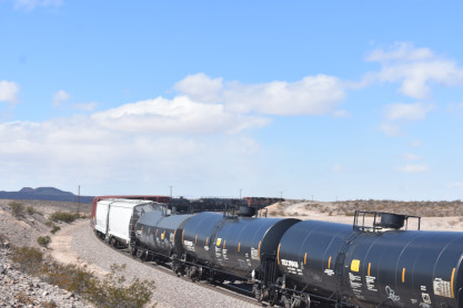 3/5/2022 Elizabeth and I met Bill at the truck at 7:15 AM and he drove west to Lenwood Road and the Black Bear Diner where I enjoyed French Toast and bacon for my breakfast. After that we drove east on Interstate 40 to Nebo Road and took National Grails Highway east to Newberry Springs, where we returned to Interstate 40 to Ludlow and exited onto National Trails Highway, taking that to Ash Hill and overlooking the cut. The wind was blowing really hard so I used the truck as a shield and stayed outside in my lawn chair reading magazines. Our wait was not long before the first train.