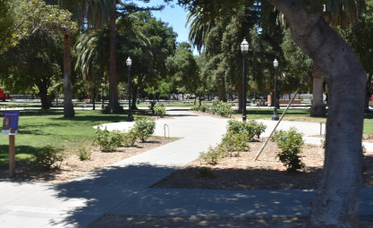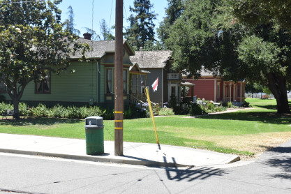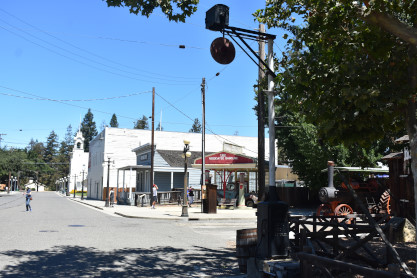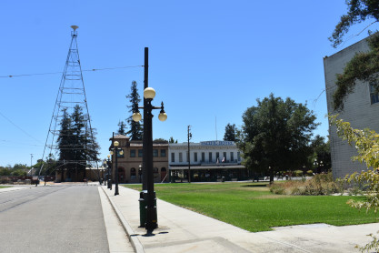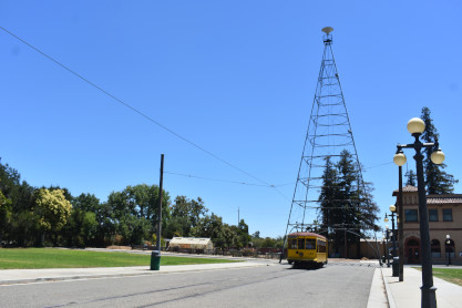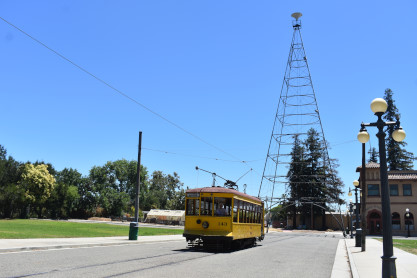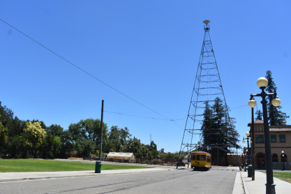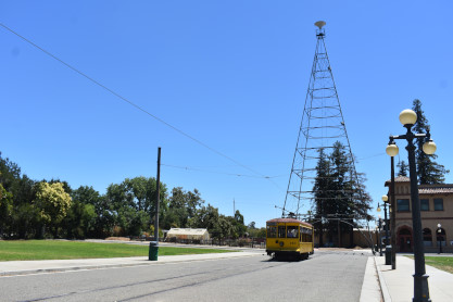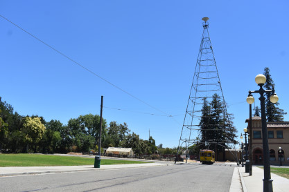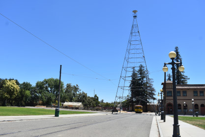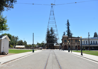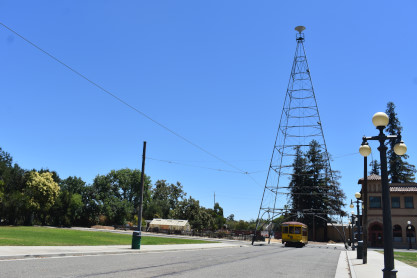 This tower, rising 115 feet, is a half-size replica of San Jose's electric light tower which was a gift from the San Jose Real Estate Board, built at a cost of $65,000 and was lit up at History Park for the first time on May 1, 1977. The original light tower straddled the intersection of Market and Santa Clara streets in downtown San Jose, and was the inspiration of J. J. Owen, editor of the San Jose Mercury. On May 13, 1881, Owen printed an editorial suggesting that by providing one high and immense source of arc light, the night would become as day for the downtown area. With the enthusiastic financial support of local citizens, construction began that August, and on December 13, 1881, the gigantic 237-foot tower was lit. The tower proved to be more spectacular than practical, since its 24,000 candlepower failed to sufficiently light the streets. The tower was to light up the downtown area, the theory being that enough light from a high enough source could do so. However, the six carbon arc lights at the top of the tower lit the sky, not the streets. The carbons for the arc lamps burned out and had to be replaced. The small lights running down and around the tower were added later. Local farmers complained that the tower’s lights disturbed their chickens and prevented them from roosting. Another common problem was that intoxicated individuals tried to climb the tower after leaving nearby bars. Neighborhood children used pieces of carbon under the lamp fixtures for their hopscotch games, and also enjoyed viewing fireworks launched from the tower as well as the decorations placed on it at Christmas. Although it did not fulfill its original purpose, the tower was a success in that it represented progress to the people of San Jose, because electricity was a relatively new source of power in the late nineteenth and early twentieth centuries. Already damaged by a windstorm in February 1915, the tower completely collapsed into the street on December 3, 1915 at 11:55 a.m. The tower telescoped into itself and no one was hurt.