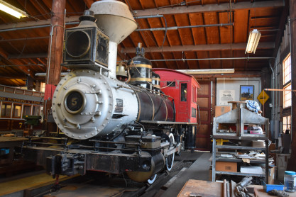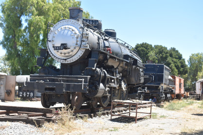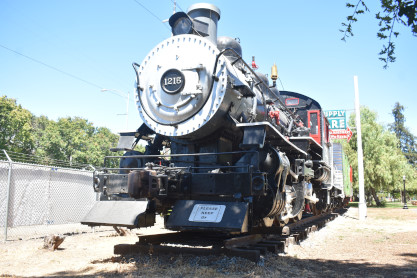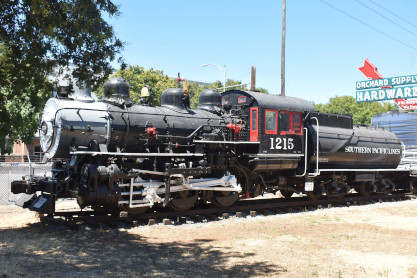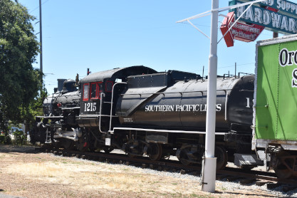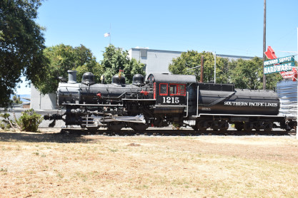 Southern Pacific 0-6-0 1215 built by Baldwin 1913. 1215 was one of the first "modern" steam switchers on the railroad, equipped with superheating and piston valves. The locomotive was originally assigned to the Dunsmuir rail yard near Mount Shasta, and used mainly on the Southern Pacific's Western Division out of Oakland, Sacramento and Bakersfield. It last operated in San Francisco before being retired in 1957. The following year, it was donated to Hanford for a park display. The Feather River Railroad Society bought 1215 in 1995 and moved it to their Portola Railroad Museum. The California Trolley and Railroad Corporation acquired the locomotive from the Museum in 2004.