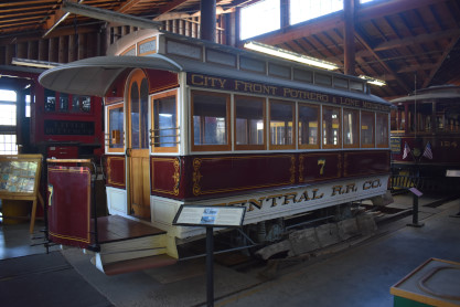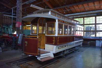 Central Railroad Horse Drawn Streetcar 7 built by John Stephson in 1863 and was shipped to San Francisco around the Horn with several other horse-drawn streetcars. It ran on the Central Railroad from the Ferry Building to Potrero and Lone Mountain through the business district north of Market Street. After service as a horse drawn car, it may have been used as a trailer on cable cars. After 25 years of service, it became a tool shed until it was reduced and exhibited on the Hyde street pier for some years. The remains were acquired by the CTRC and restoration was completed in 1993.