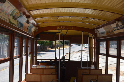 Portuguese Trolley Car 168 built by the Brill Company in 1934 in Portugal in 1934 to a turn-of-the-century design. It operated in Porto, Portugal until it came to San Jose in the early 1980's. Significant refurbishment has been done in San Jose including installation of a new ceiling and re-upholster of the seats.