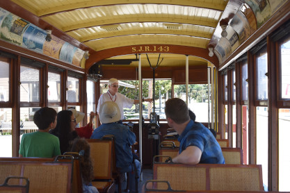 The California Trolley and Railroad Corporation began its Historical Restoration Project in 1982 to restore six vintage streetcars. The Trolley Barn was built in 1984 in the style of trolley buildings of the early 1900s as a place to restore and display these streetcars. By 1988 the first restored trolleys were being used for public transportation in downtown San Jose, where they continue to operate today. Tracks from the barn extend the length of Kelley Park to Happy Hollow Park and Zoo, and free streetcar rides are available to the public on weekends. The Trolley Barn and trolleys are featured in the Historic Transportation Experience School Program. The Trolley Barn is a joint project with the California Trolley & Railroad Corporation. Visit their website for a history of the trolley restoration project at History Park, as well as background on the trolleys in operation at the Park today.