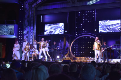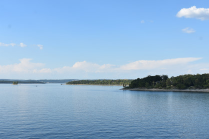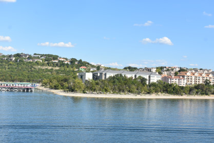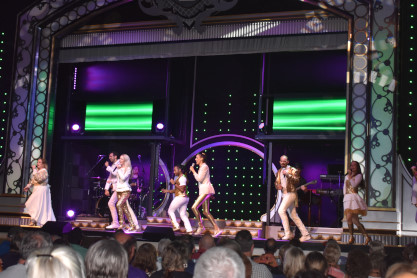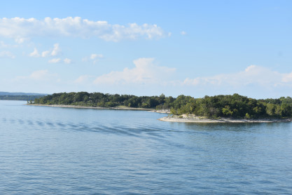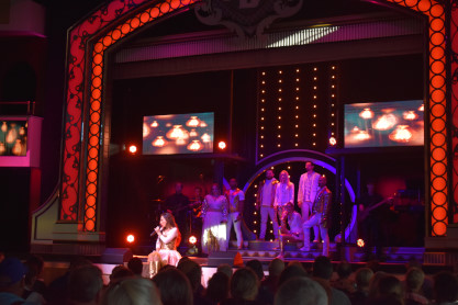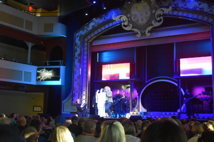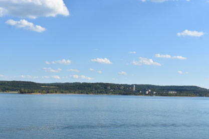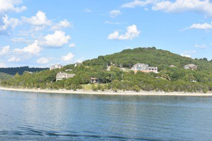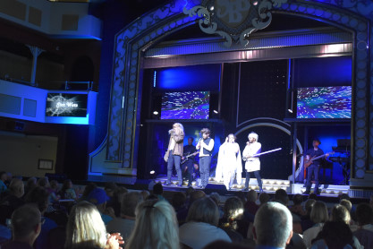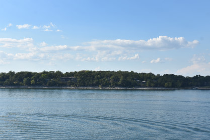 More views of the shore of Table Lake on this warm late afternoon on the first day of autumn. We returned to the lower decks and visited the gift shop where we acquired magnets, two mugs and a Christmas ornament; the T-shirt designs did not appeal to us. We then returned to our seats where a dessert of butter cake was waiting for us then enjoyed the show which featured rock and roll songs which was up my alley.