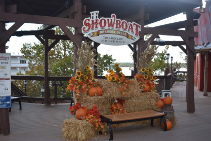 Showboat Branson Belle Table Lake latitude and longitude coordinates and a harvest display. We walked to the boarding gate and down a path where an employee scanned our tickets.