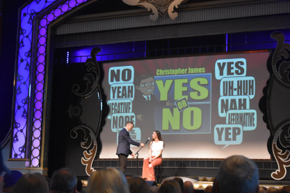 Christopher James, our evening host and a magician played a game of Yes and No with audience members. They engaged in conversation but could not say 'yes' or 'no' (or similar words). None of the contestants lasted the whole three minutes but one lady came close. The meals were then served and the first course was a salad, which I declined, then dinner rolls, which I received two of from our server followed by the main course of chicken and pot roast with mashed pototoes and green beans. We both enjoyed our meals and aftewards went up to the top deck.
