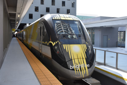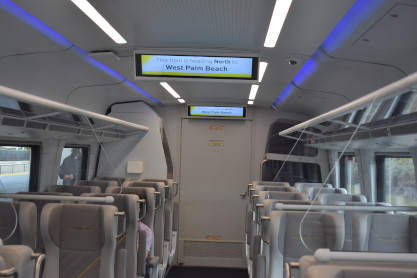 Rolling stockAll Aboard Florida ordered five Siemens trainsets in 2014. Each Brightline trainset initially consisted of four passenger coaches, with a Siemens Charger SCB-40 diesel-electric locomotive on each end. The coaches, with interiors designed by the LAB at Rockwell Group, feature ergonomic seating, Wi-Fi, level boarding and meet ADA compliance standards. Each trainset holds 248 passengers. Working with All Aboard Florida, the LAB also conceived the Brightline name, brand platform, and visual identity. The entire trainset, including passenger cars, were manufactured by Siemens in its solar-powered plant in Florin, California. Once the route to Orlando is in operation, the trainsets will be expanded to seven coaches, and five more complete trainsets will be purchased. The first of five trainsets departed the Siemens factory on December 8, 2016, and arrived in West Palm Beach on December 14. The fifth trainset arrived in South Florida in October 2017.