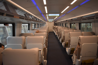 The trains offers two classes of service, with one "Select" coach and three "Smart" coaches on each trainset. "Select" offers 2x1 and four-to-a-table seating with 50 21-inch-wide seats per car and complimentary snacks and beverages, while the slightly less expensive "Smart" fare coaches seat 66 with narrower 19-inch-wide seats, with snacks and beverages available for purchase. Each trainset is able to hold 248 passengers.