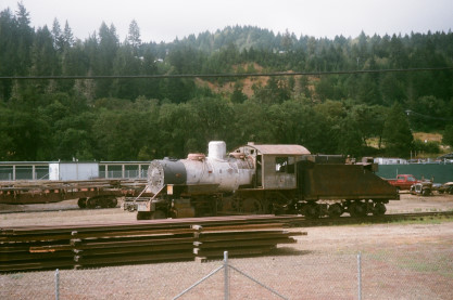 In the Roots of Motive Power yard was Baldo Locomotive Works 2-6-2 4, ex. Fred Kepner collection in Merrill, Oregon, exx. Gene Autry 1957, exxx. scrap dealer in Pittsburg, California 1955, exxx. Long Bell Lumber Company 4 1926, nee Weed Lumber Company 4, built by Baldwin in 1907.