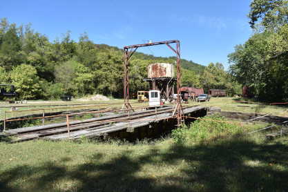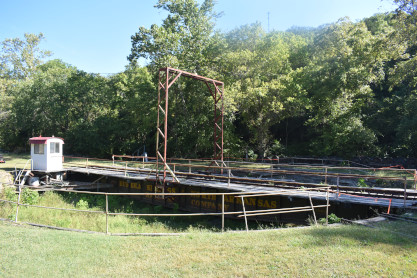St. Louis-San Francisco Railroad turntable built in 1908. I walked back to the station and after giving an introduction, the conductor, Greg, asked me say to "All Aboard" then gave me a smashed penny as a thank you. Everyone then boarded and Elizabeth and I sat at the back of the coach.