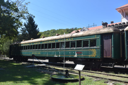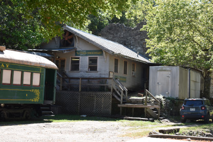 Passengers board at the depot of the Eureka Springs & North Arkansas Railway, originally built in 1912-13 to replace a wooden depot built in the 1880s. The passenger train uses several former Rock Island P-70 coaches. There have actually been as many as seven of these cars on the property at any one time. Two cars were used for the regular passenger service - maroon 2560 and green 2585. Two more are used for the dinner train, currently numbered 1 and 2. Two more are used as buildings - 2515 is used as a snack bar while 2523 has been used as an office. Another coach, 2593, was also once here.