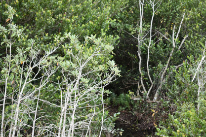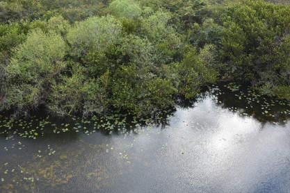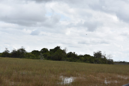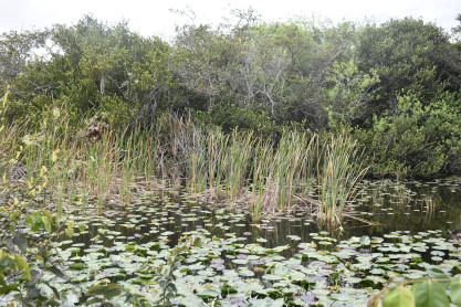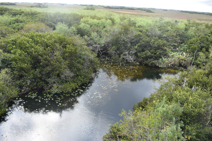 These Tropical Hardwood Hammocks have a sinkhole with water in them where American Alligators and other animals hide during dry spells. These dense island forests grow on slightly elevated land and rarely flood. Temperate trees such as live oak, are out-numbered by tropical mahogay, gumo-limbo, mastic and others. Ferns and air plants thrive heare. Natural moates are hammocks help protect them from fire.