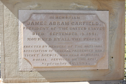 The moneument says "In Memorian James Abram Garfield President of the United States Died on September 19, 1881. Mourned by all the people. Erected by members of the National Passengers Assciation of General Passengers and Ticket Agents who held memorial burial services on this spot on September 26, 1881".