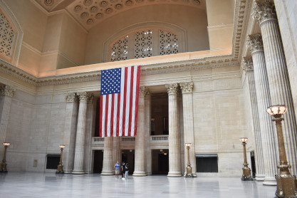 Elizabeth and I walked into the Great Hall in Chicago Union Station then went to Jersey Mike's for linner. While Elizabeth waited there to order, I walked over to Walgreen's for a new Copper Fit knee support. I was successful and returned shortly to enjoy our good food, after which we walked to the front of Metra 2011 for a picture.