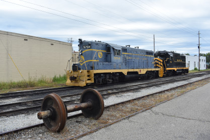 A railroad wheel, Chesapeake and Ohio GP7 5704 and Nickel Plate GP30 901.
