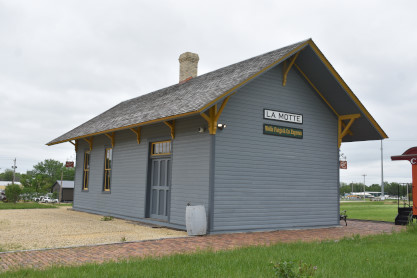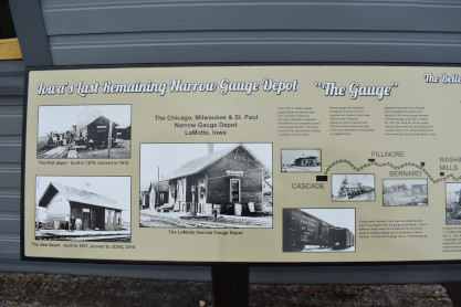 Milwaukee Road Luana station. We returned to the car and headed to Maquoketan where the station from La Motte is now located. The Chicago, Milwaukee & St. Paul Narrow Gauge Depot in LaMotte is a historic building formerly located in La Motte. The Chicago, Bellevue, Cascade & Western Railroad was incorporated in August 1877, to build a narrow-gauge railway from Bellevue to Cascade. Narrow-gauge was chosen because it was cheaper to build, and it could negotiate the tight turns on the rugged terrain better. Construction began the following year, but lack of money doomed the project. The Chicago, Clinton, Dubuque and Minnesota Railroad took over the project, and it was completed on December 30, 1879. The first train reached Cascade on January 1, 1880. Ten months later they sold all their holdings to the Chicago, Milwaukee & St. Paul Railroad, and this line became a branch line of the Milwaukee Road. That same year a frame depot was built in La Motte. It served as a combination freight and passenger station until it was destroyed by fire in 1910. This depot replaced it the following year. The one-and-a-half storey frame combination station represents the corporate style and standardized practices of the Milwaukee Road. However, it reflects the depots they built in the late 19th century, so it was somewhat outdated when it was built.