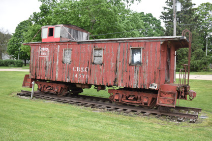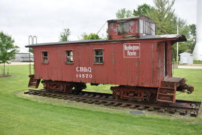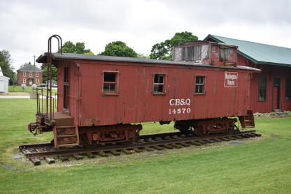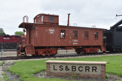Chicago, Burlington and Quincy wooden caboose 14451 built by the Aurora Shops in 1911. The LS&BC RR sign is in commemoration of the LaSalle and Bureau County Railroad Company which operated 15 miles of track in north central Illinois. The "Bee" (as it was called locally) was founded in 1892 to provide a connection for the zinc mines of LaSalle to the neighboring railroads. In LaSalle, the LS&BC connected with the Illinois Central's "Gruber Line" at Midway. The line then went west to a wye (called Hegeler), where it connected with the Streator-Zearing branch of the Chicago, Burlington and Quincy, along with the DeKalb-Spring Valley branch of the Chicago and North Western. The LS&BC then had to complete a "flatland switchback" in order to gain access to the New York Central's Illinois Division track (at Churchill), which provided the LS&BC with access to Ladd, Illinois. After the Rock Island folded in the early 1980s, the LS&BC took over some of the switching operations on the south side of Chicago. The LS&BC also operated some former Milwaukee Road trackage around Mendota after Milwaukee's retrenchment, but that service was eventually taken over by the Burlington Northern. Operations at LaSalle lasted until 1986, at which time the ICG abandoned the Gruber Line, stranding the LS&BC. The last day of operation was March 25, 1986. The name LS&BC ended when the name of the Chicago switching operation was changed to Chicago Rail Link. The CRL exists to this day, as a part of the OmniTRAX Inc. group.