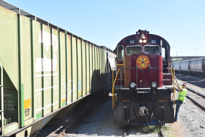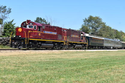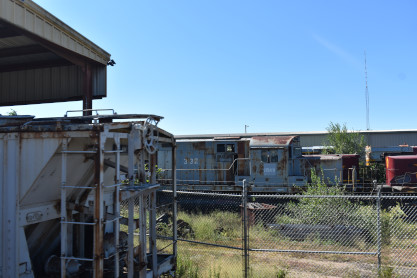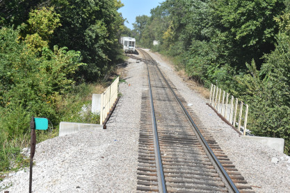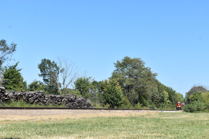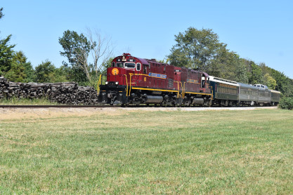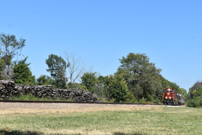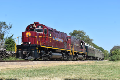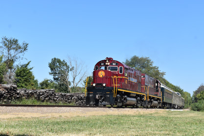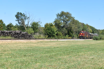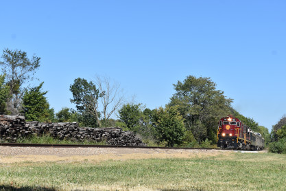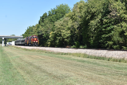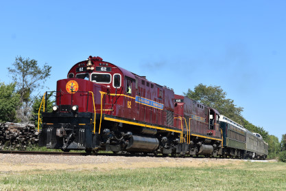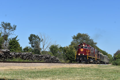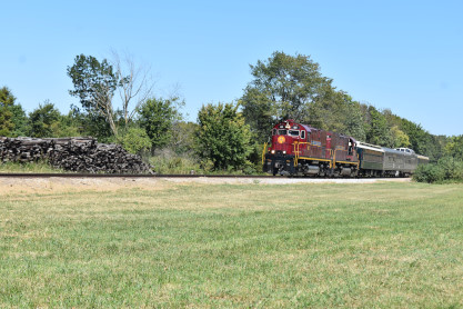 Photo runby three at South Monett. We reboarded the train and enjoyed a lunch of pulled pork sandwich, choice of coleslaw or potato chips (we both chose the latter) and apple pie. There were complimentary snacks available throughout the trip and this service was appreciated by all. I finished the Shop Story as we made our way to Exeter, the last photo runbys of the trip.
