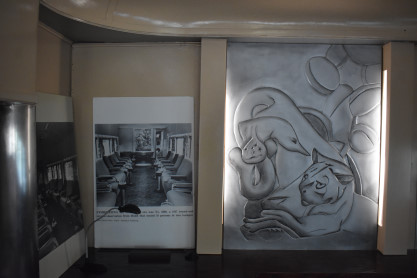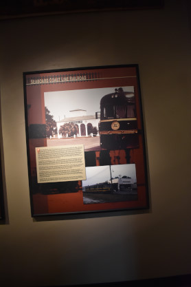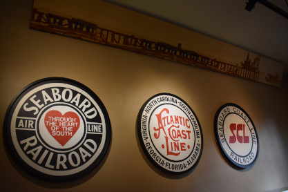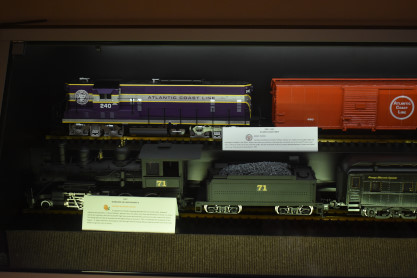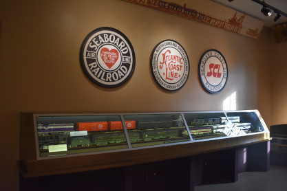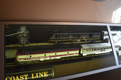 The emblems of the railroads that made up Seaboard Coast Lines and model trains below.