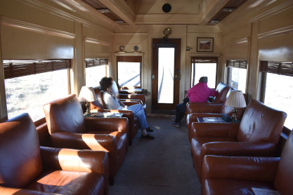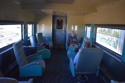 We all boarded Northern Pacific 529 and sat facing forward as the crew took our luggage to our rooms or left the larger bags in the lower level of this car. The train took off and Elizabeth was in "Heaven" as she really was enjoying the forward view of the dome. The train went east through Santa Ana Camyon giving Elizabeth and I a view we had never experienced. The trip was fantastic from the start and it was now dinner time, so we just sat at the table and Elizabeth enjoyed her salad. Salmon with asparagus and potatoes was the entree and a lemon sorbet with lemon cake was our dessert. The meal lasted through the stops at Riverside and San Bernardino and we started the trip up the grade to Cajon Pass. Elizabeh was able to enjoy her first trip around Sullivan's Curve and the trip to Summit. Before arriving in Victorville, we went into the Kitchi Gammi Club and took seats. The long and busy past few days were catching up to Elizabeh so before we arrived in Barstow, she excused herself and went back to the room and at Barstow, I did the same thing. It had been a great day of train riding and I was looking forward to our next two days of riding private cars.