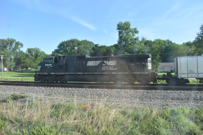 Norfok Southern 9929 West at Camden, Missouri. The train was routed onto the Norfolk Southern mainline so Elizabeth was on the old Wabash Railroad. I continued working after breakfast and took a break as we approached La Plata where I showed everyone the Chris Guenzler Million Mile Lookout Point. The train ran on to Fort Madison where I chose to stay on.