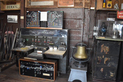 The CTC Board for Cahill Station, other locations and a locomotive bell.