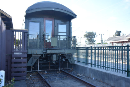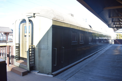 The rear platform of the Oregon, Washington and Navigation Company cafe/lounge/observation car 184, built by Pullman in 1912. It is owned by the South Bay Historical Society.