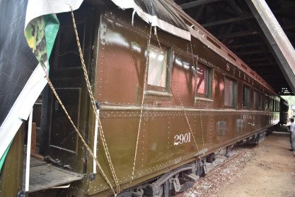 However, at the last minute, the railroad donated the car to the Central Coast Railway Club. The car was donated to the club by Southern Pacific in February of 1956. The club's first trip with the car was to be the February 12, 1956 trip to Sacramento, however, delivery of the car by the railroad was delayed and Southern Pacific 2902 was substituted instead. It appears that the inaugural trip under Central Coast ownership was the Inside Gateway trip to Bieber over the Western Pacific during September 1-3, 1956. Interestingly, the car did operate on at least one Central Coast trip prior to the club acquiring it, that being the Arcata & Mad River trip in 1954.) The car was well utilized by the club and many trips were made over the years, taking club members all over California and parts of Oregon. At the September 1967 club meeting the membership voted 48 to 5 to sell the car to members Doug Morgan and Sam Girdler for $505. The last trip on "The Foo Car" by Central Coast was shortly after its sale to Doug and Sam, and was a New Year's Eve trip from San Jose to San Francisco on December 31, 1967. Under new ownership, 2901 was used on a few more Central Coast trips but one of its most noteworthy trips was a journey to Ogden, Utah for Union Pacific's Golden Spike Centennial. Morgan and Girdler finally sold the car to the Sierra Railroad in 1971 and 2901 was promptly shipped to the Sierra’s Jamestown yard. In 1982 California State Parks acquired the Jamestown property from the Sierra Railroad, along with the all excursion train equipment.In 2010, Fast Forward to July 2010. One hundred years after entering service, it's again possible to ride the club's former The Ferroequinologist behind steam locomotives through the California Motherlode country. During the July 4th weekend, the car was part of the celebration of 1891-built Sierra No. 3's placement back in service after a 12 year hiatus. The 2901 and two coaches were coupled to the historic 4-6-0 for what could be considered by some a reunion run. On July 2nd, with the extra weight of 2901 on the drawbar, the diminutive No. 3 began slipping on the 3% grade out of Rock Siding. The train had to back down the hill and get a running start in order to storm the grade. The resulting show at trackside was impressive.