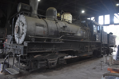 Sierra Railroad 3 truck shay 2, ex. donation to State of California, exx. Feather River Railway Company 2 1939, exxx. Feather River Pine Mills Incorporated 2 1927, nee Hutchinson Lumber 2 built by 1912. It was used to haul log trains for the lumber company's Feather River Railway from 1922 until 1966. The railroad was abandoned in 1967, after flooding of a portion of its line by Oroville Dam, thereafter Shay 2 was donated to the State of California. In 1975, Shay No. 2 was leased to the Sierra Railroad and moved to Jamestown where it was rebuilt for tourist excursion service. Today, the locomotive remains at Railtown 1897, however the locomotive is out of service awaiting restoration.